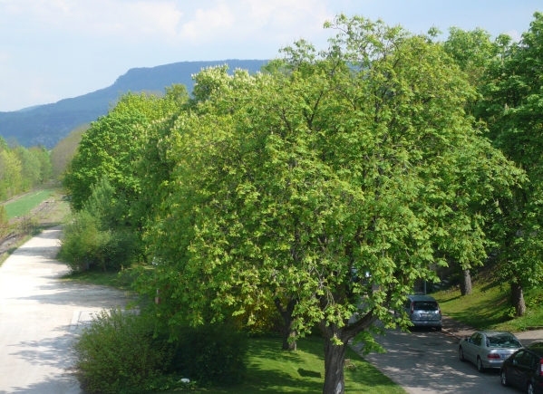 "Volksbank". Vis-a-vis des Gebäudes beginnen eine Kastanienallee
